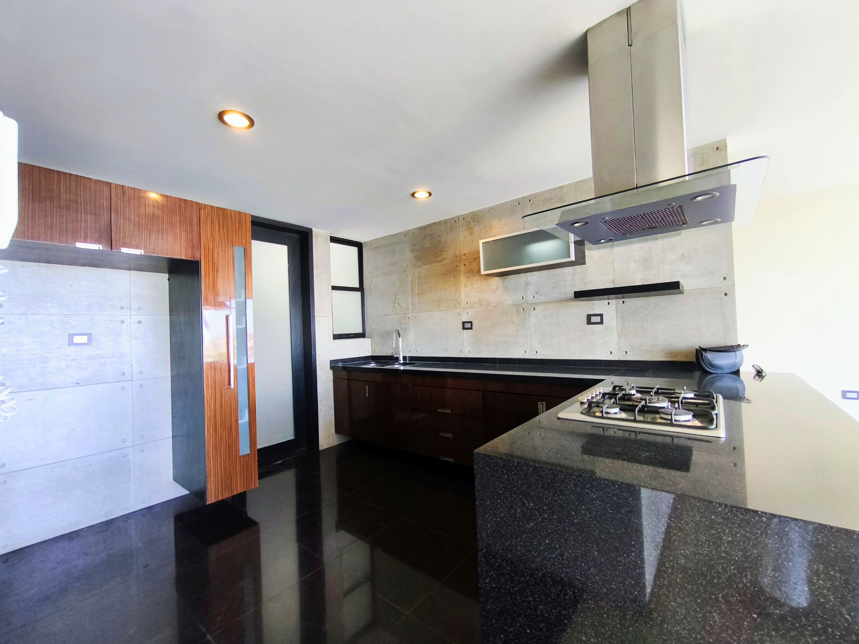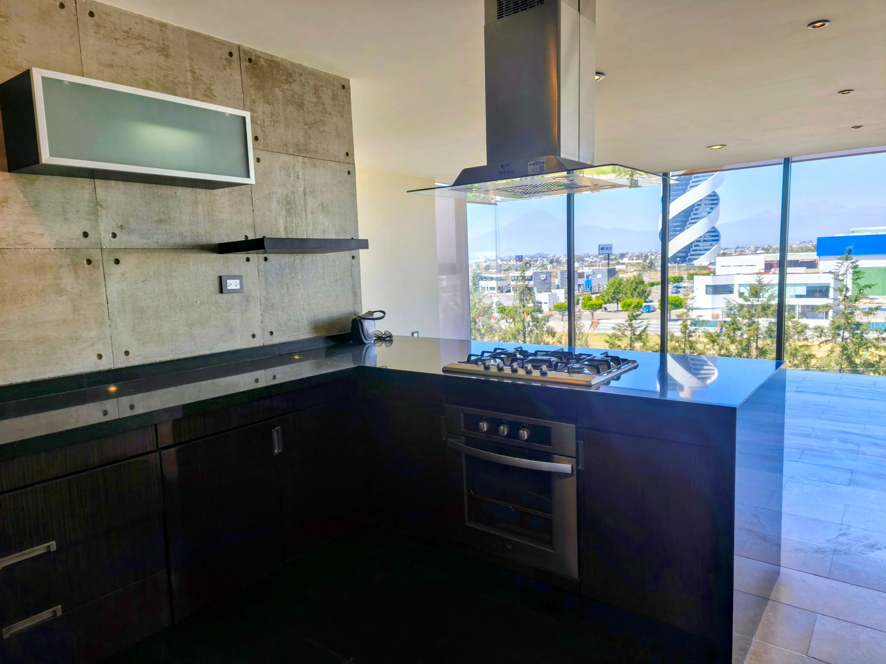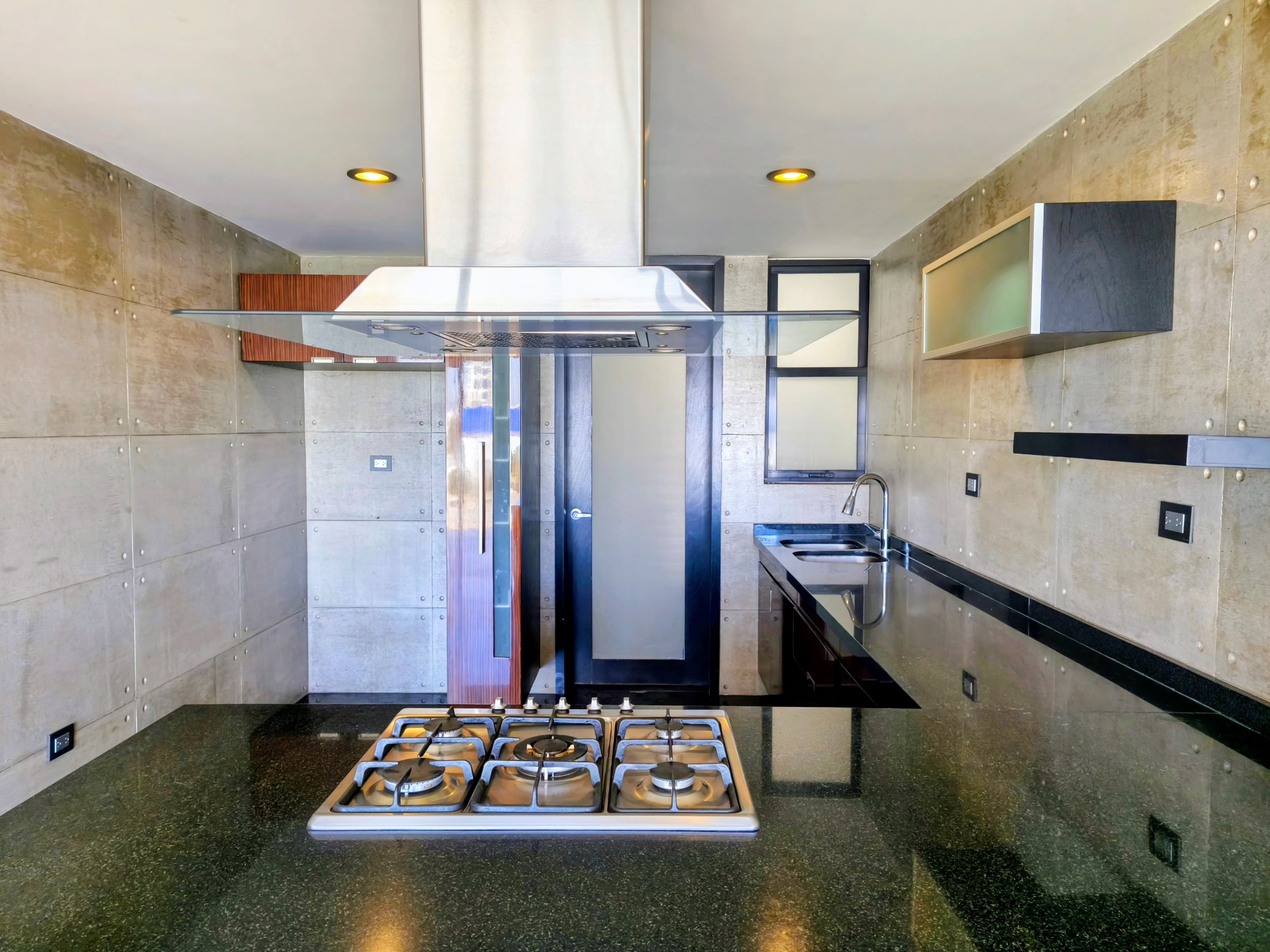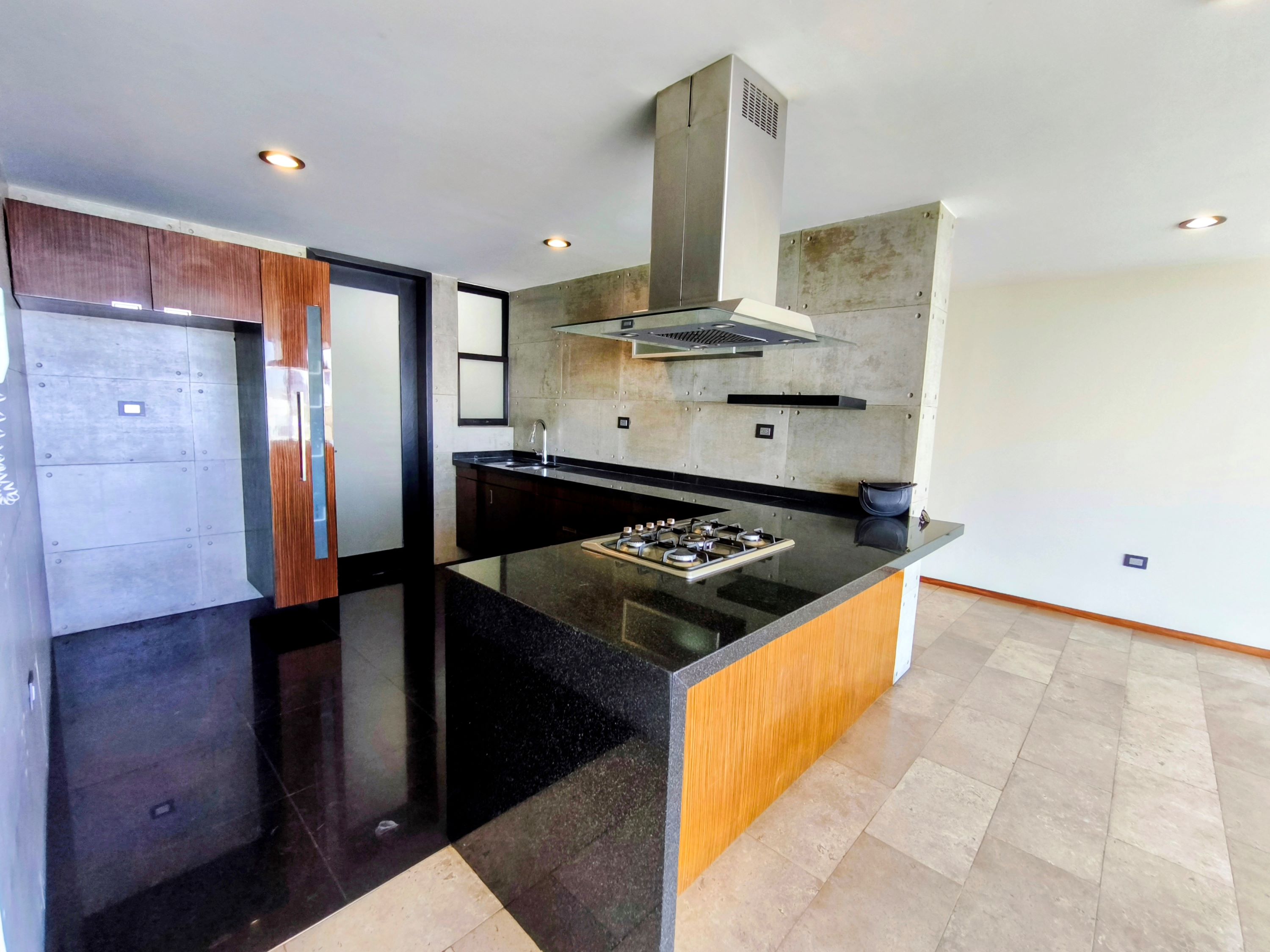 Cocina abierta con campana decorativa y diseño moderno