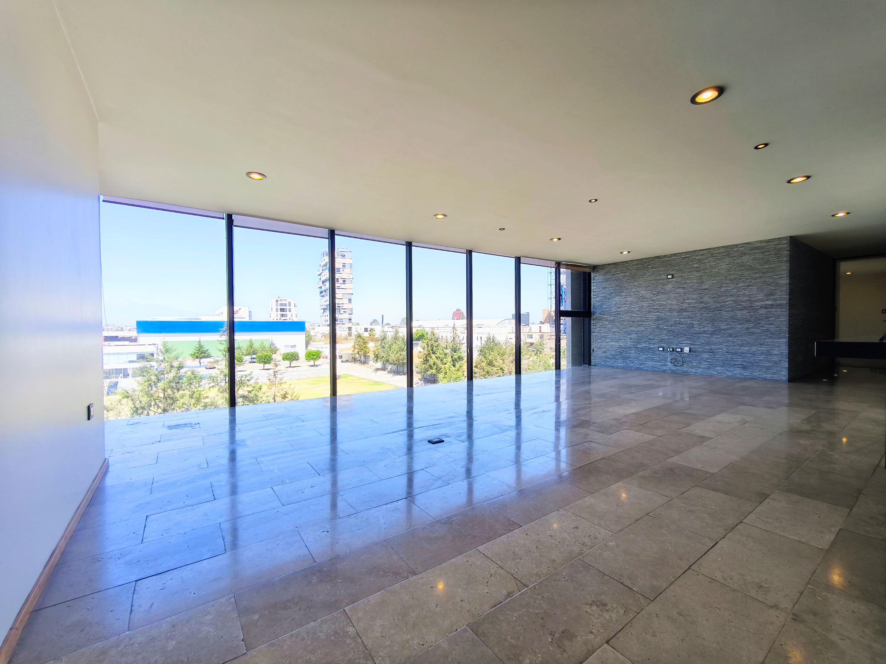 Sala y comedor con ventanales de piso a techo y vista panorámica