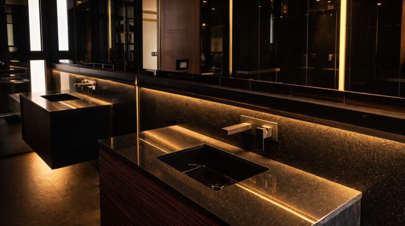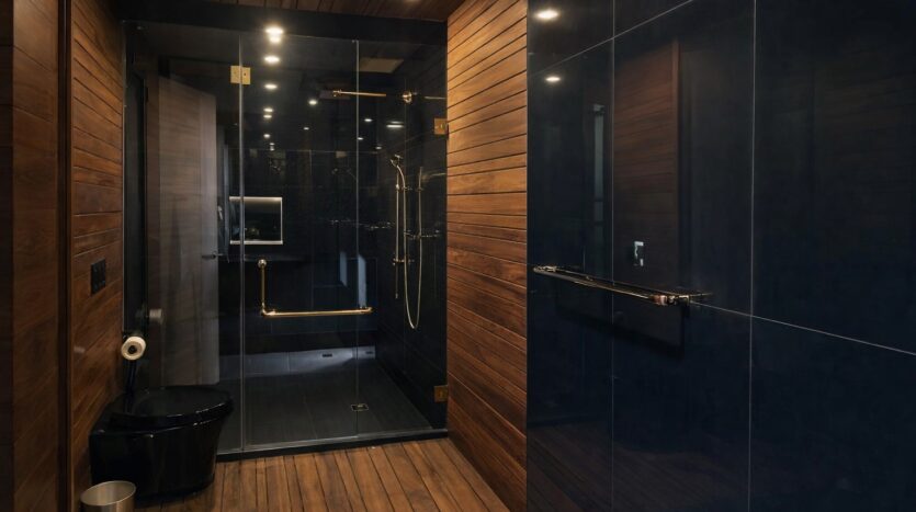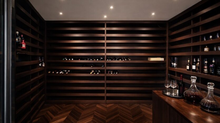 Una escalera escultórica de doble nivel en madera natural con iluminación indirecta, acompañada por una espectacular pecera integrada, que transforma el recorrido entre ambos niveles en una experiencia visual viva y completamente fuera de lo convencional.