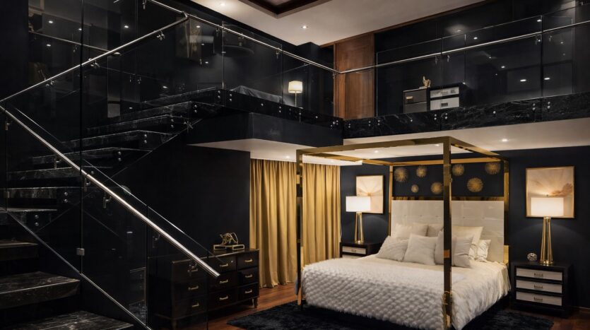 Recámara tipo loft con vestidor y detalle de televisión visible a través del cristal
