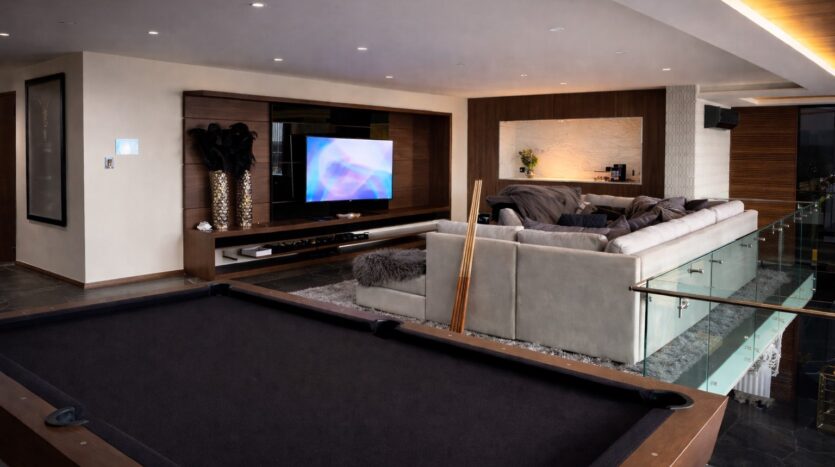 Mesa de billar integrada, creando un ambiente social elegante y relajado