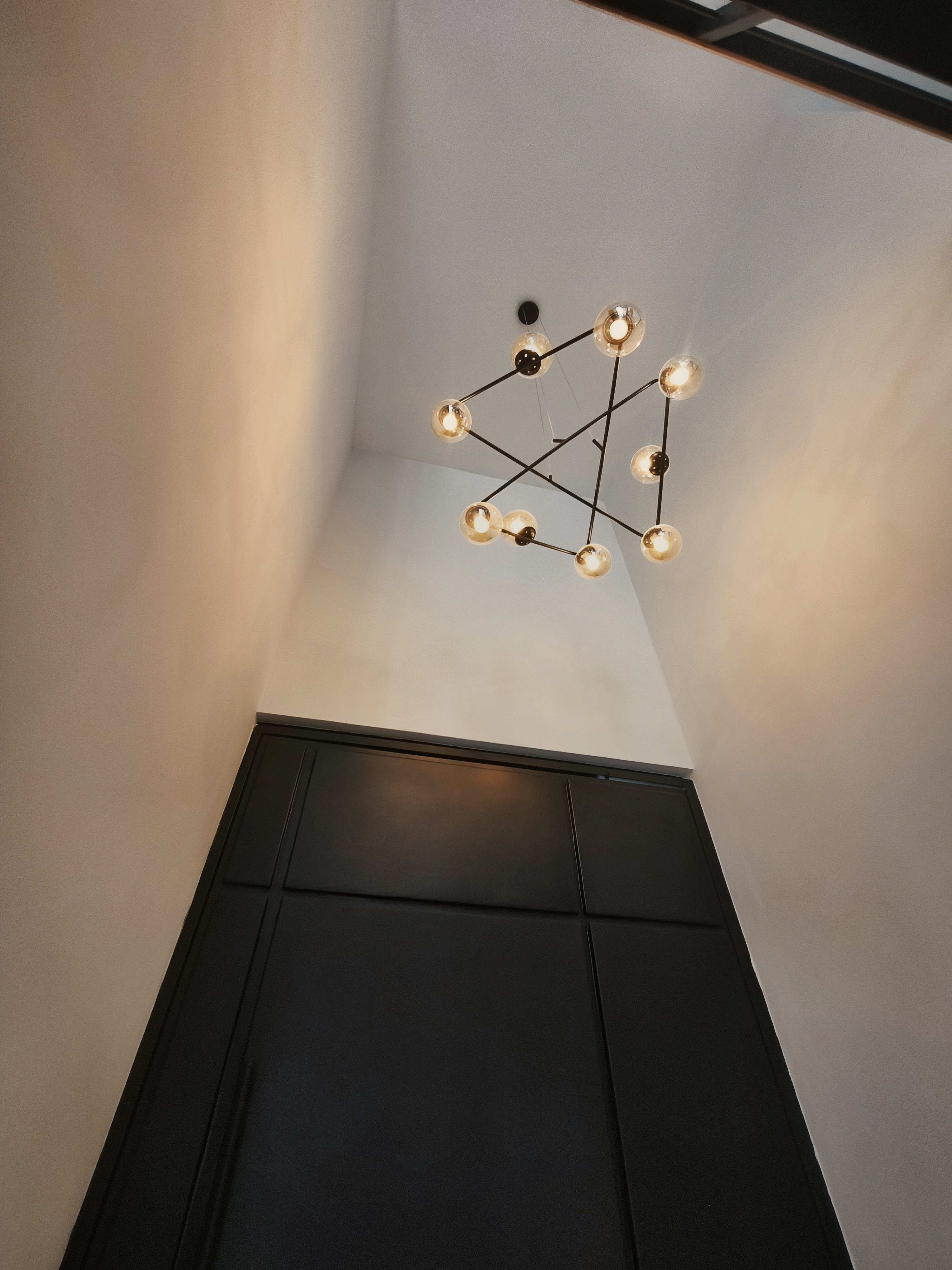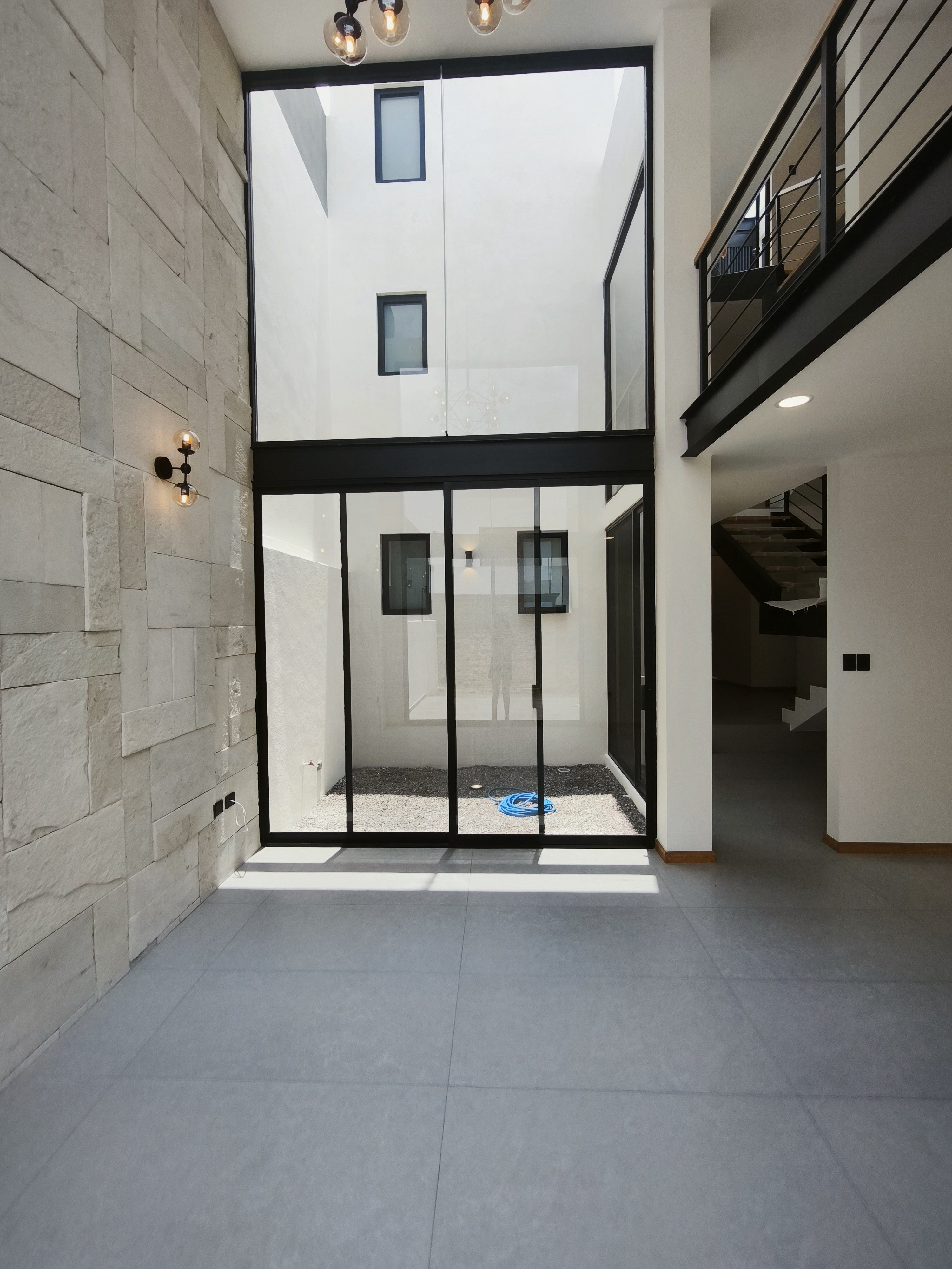El corazón de la casa es su área social con espectacular doble altura, muro decorativo en piedra natural clara y candil contemporáneo de diseño.