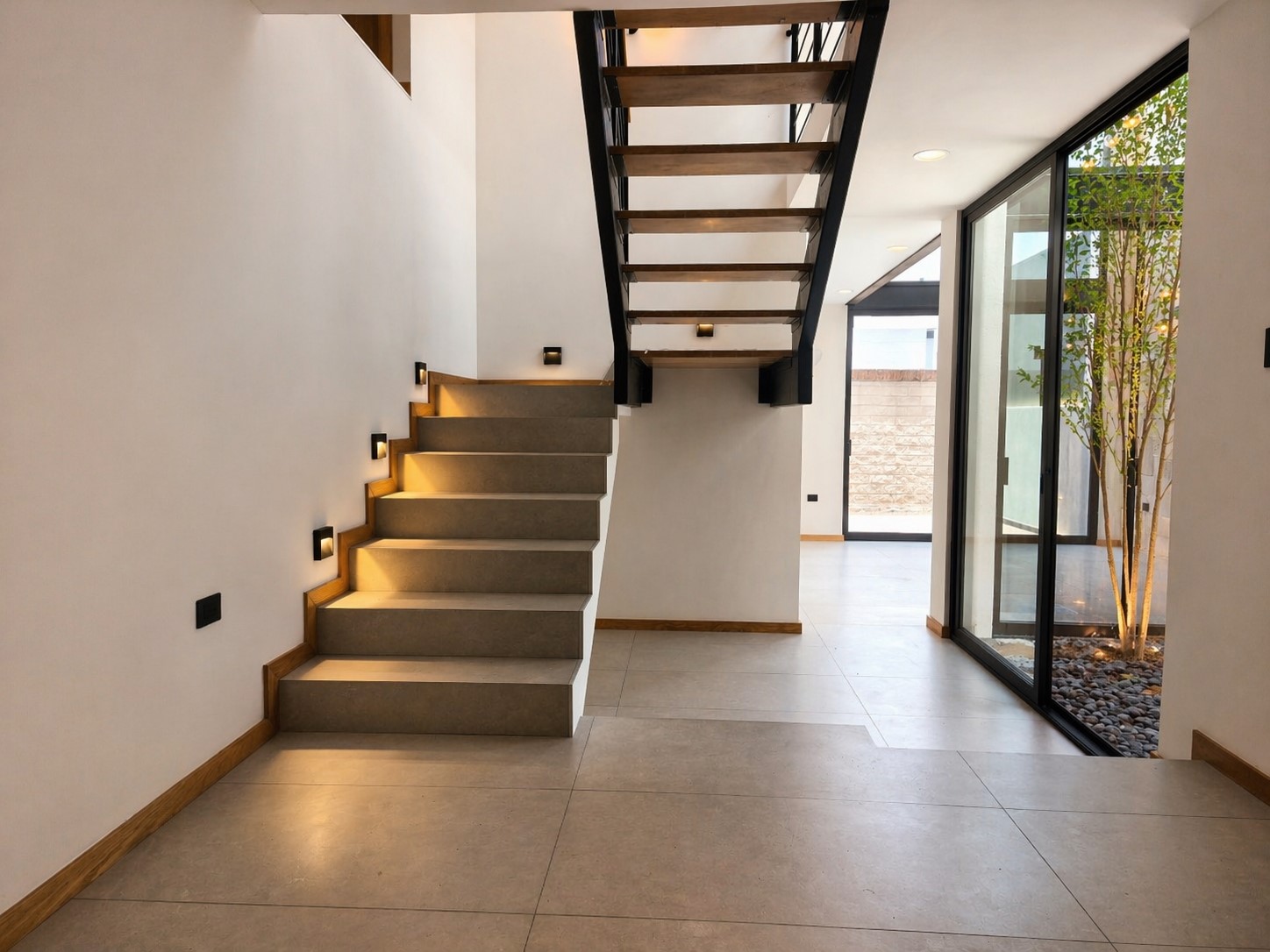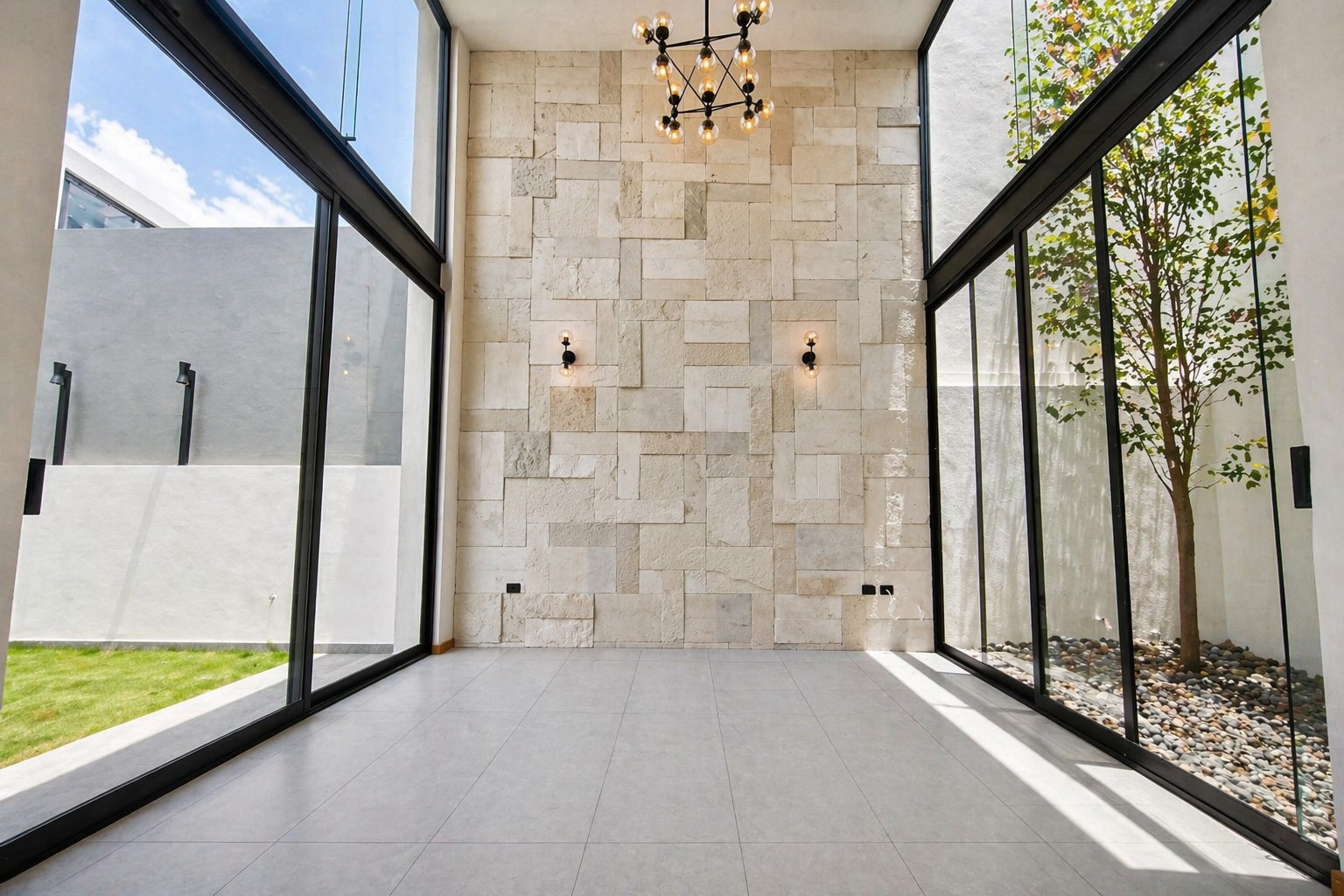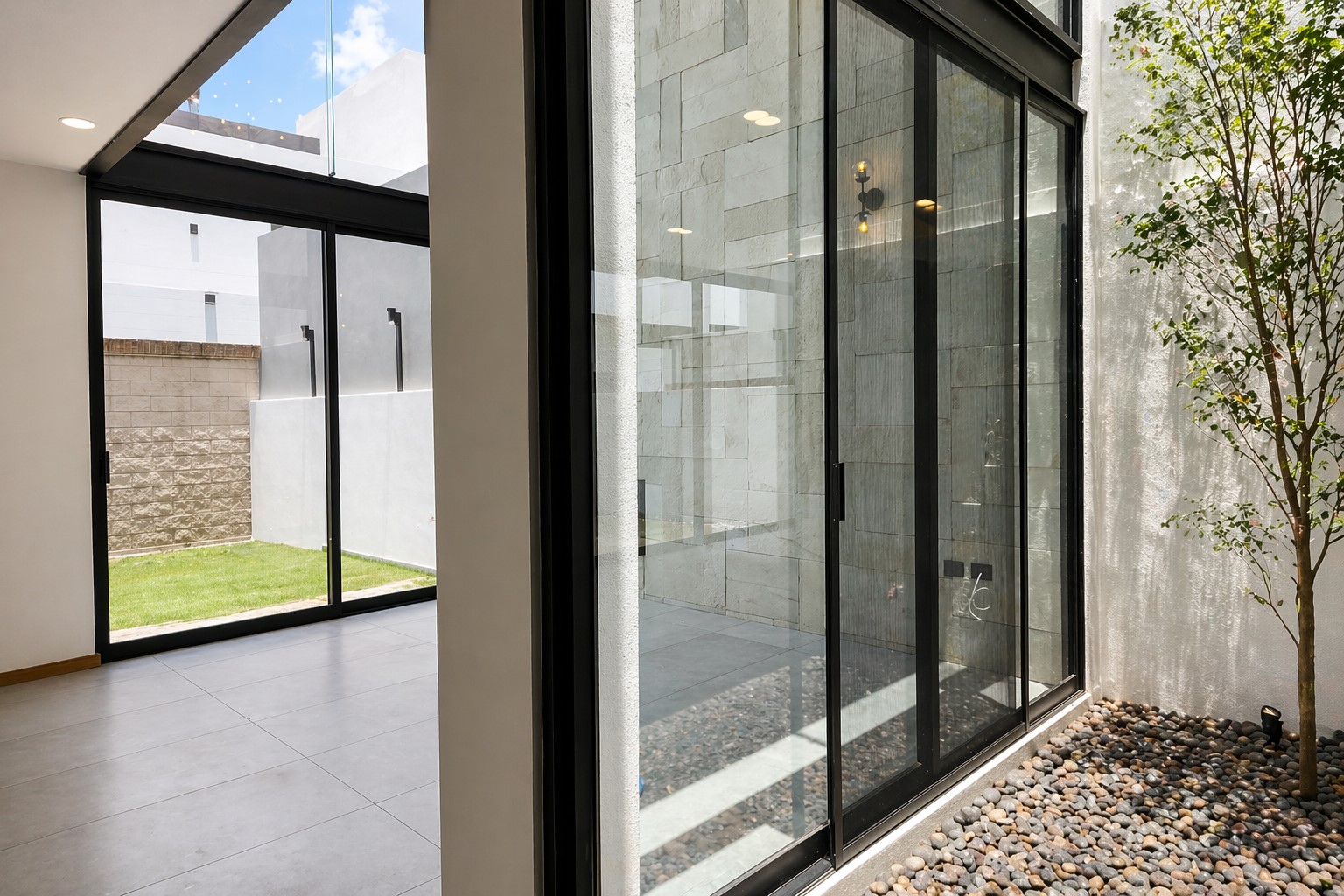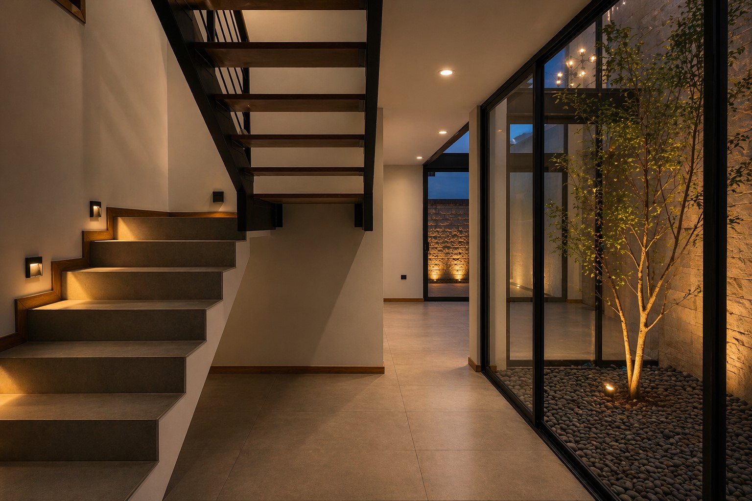 Jardín interior con árbol ornamental