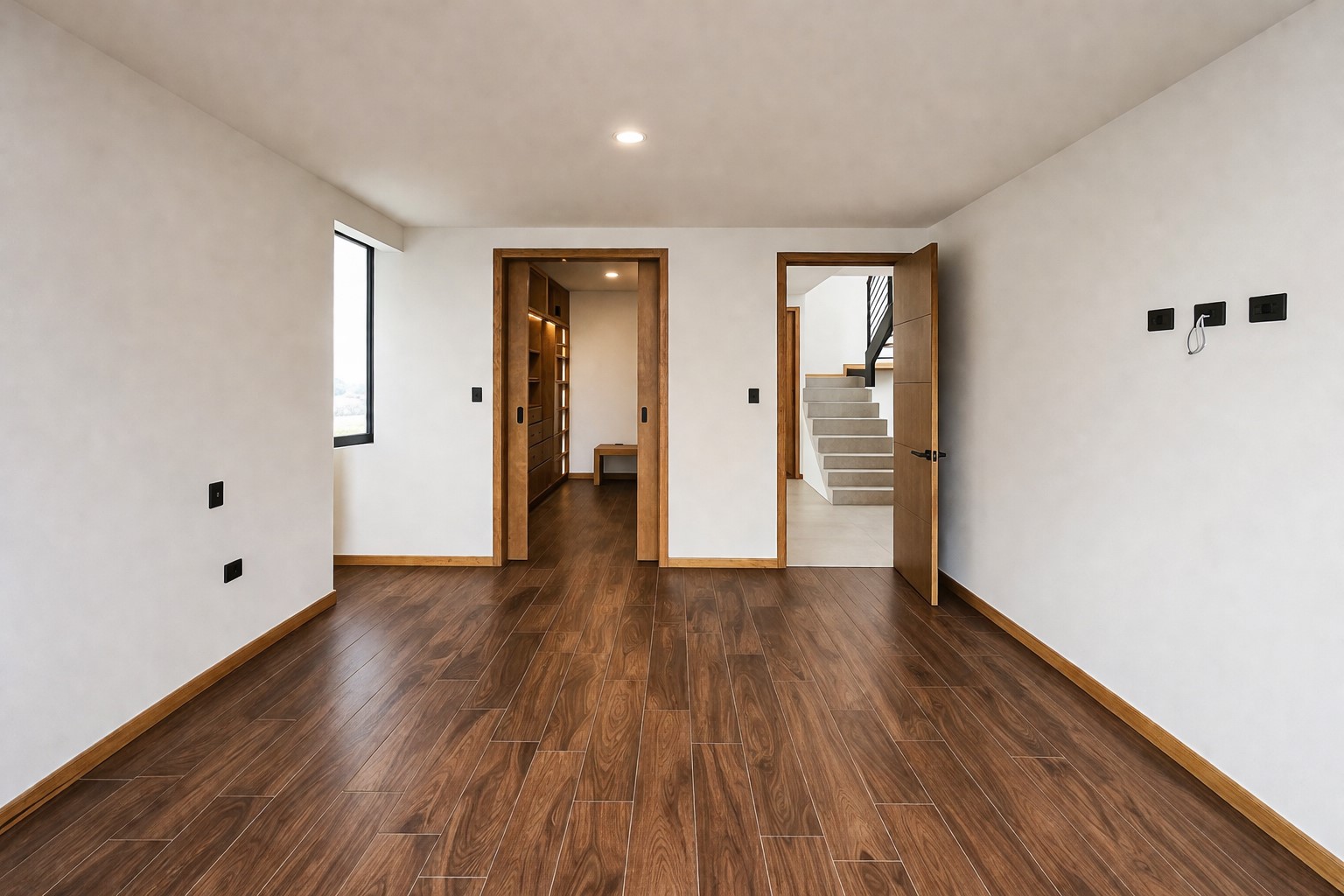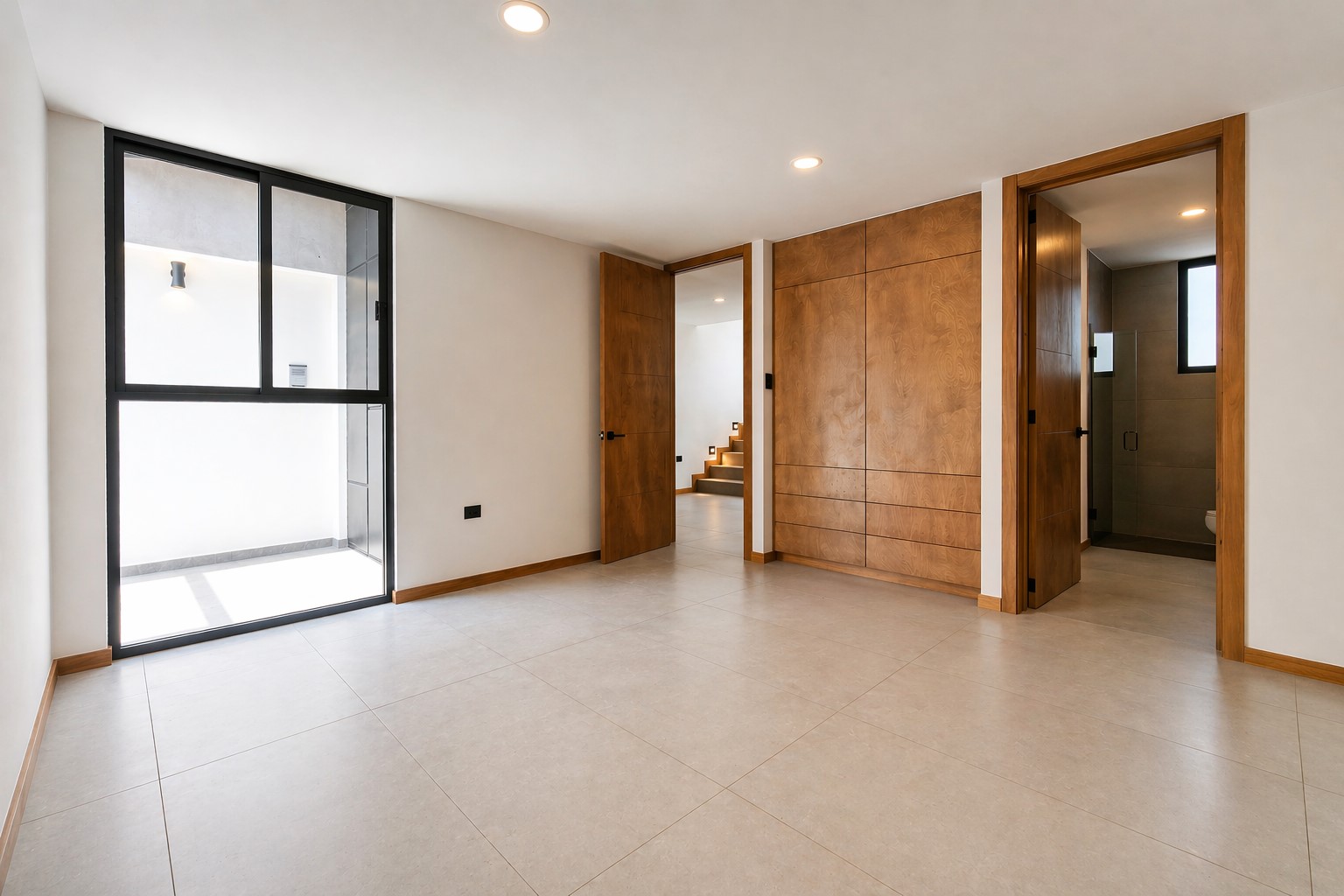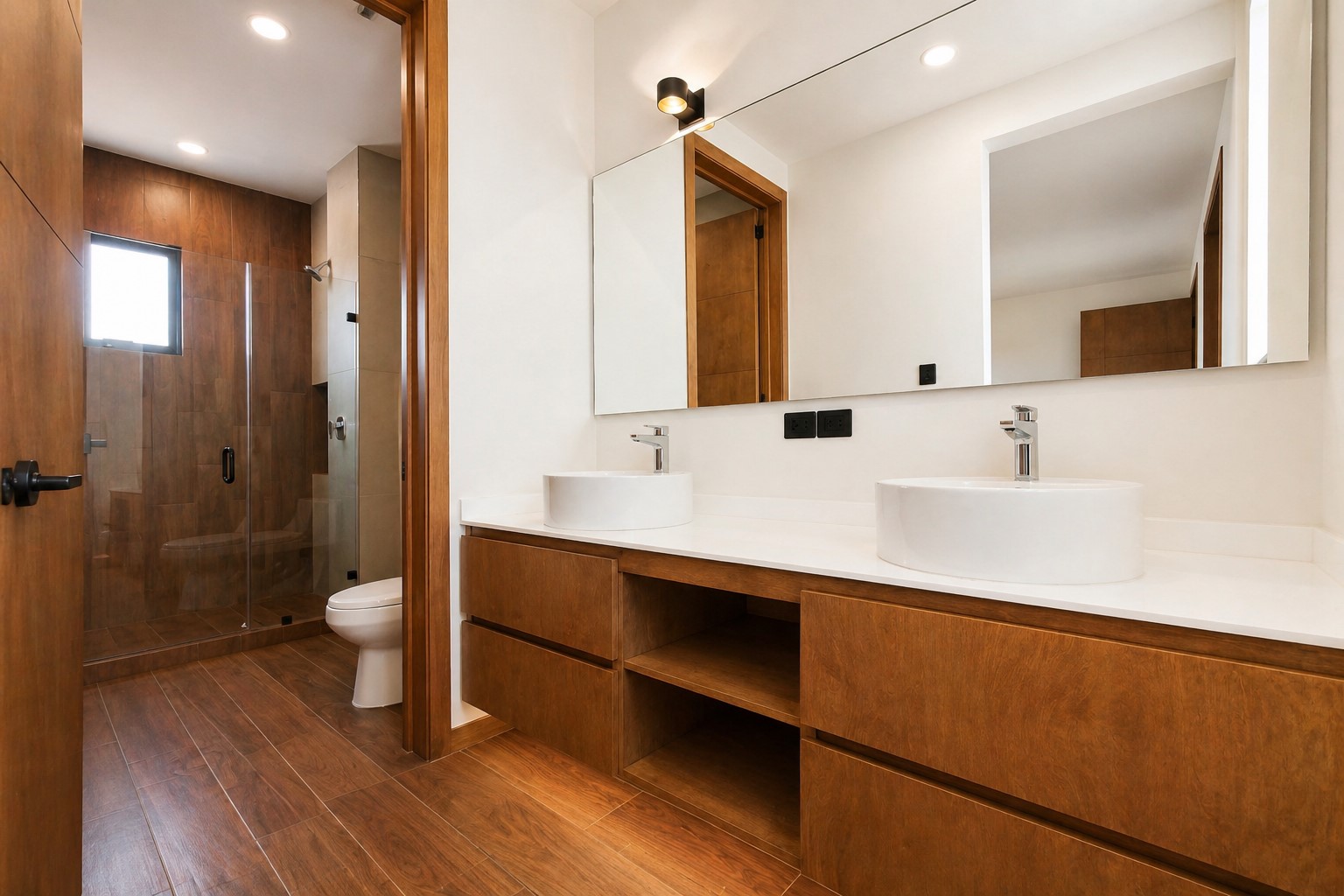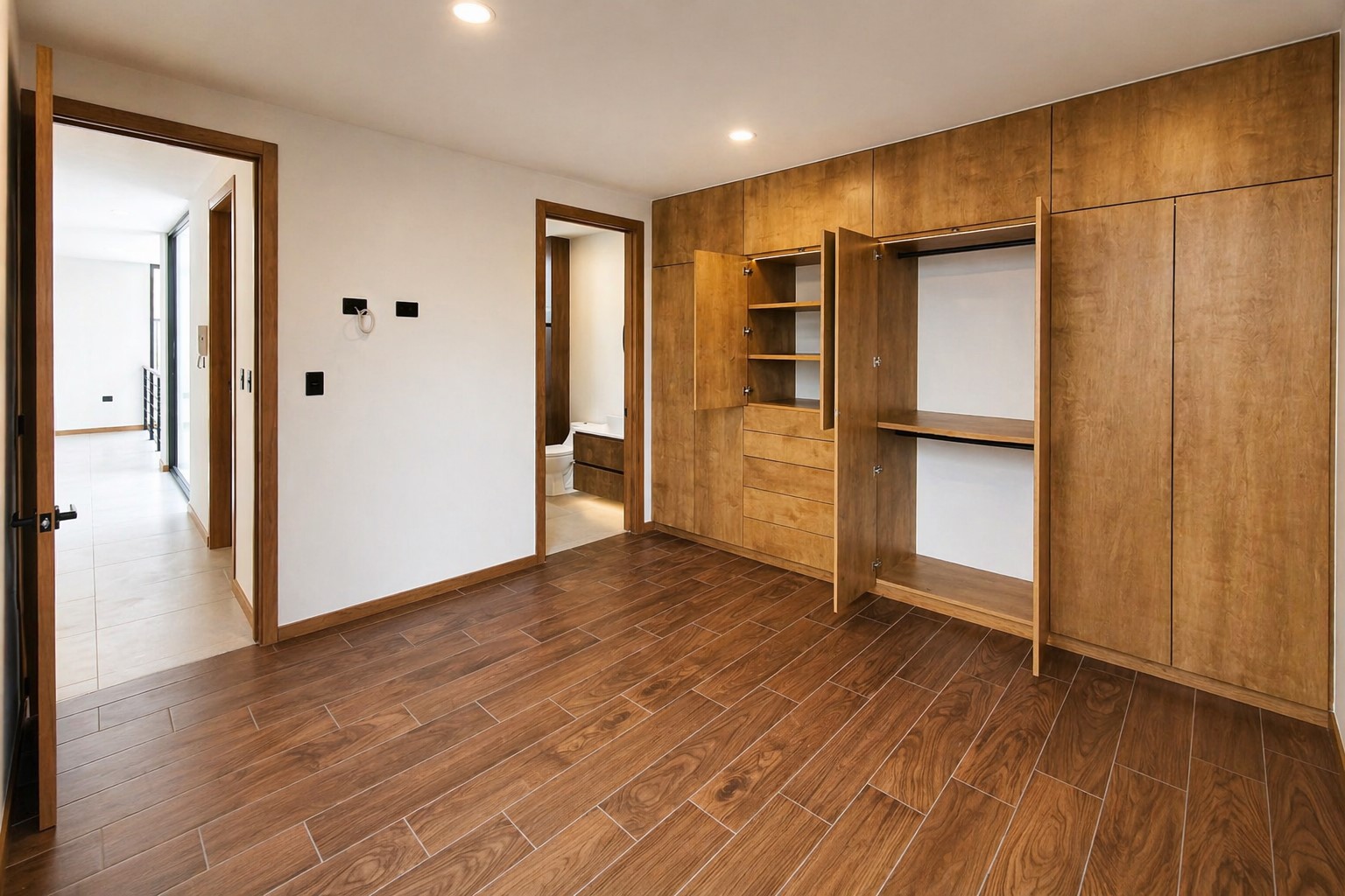 Se aprecia una carpintería en melamina texturizada tono nogal / encino ahumado, con veta natural muy elegante, utilizada en: