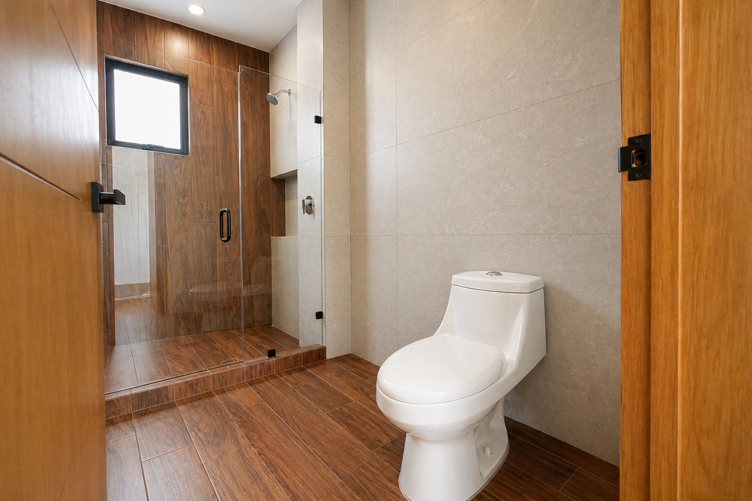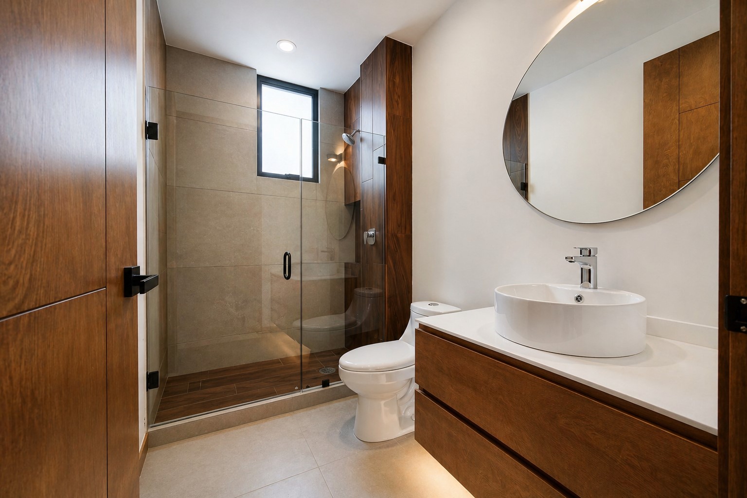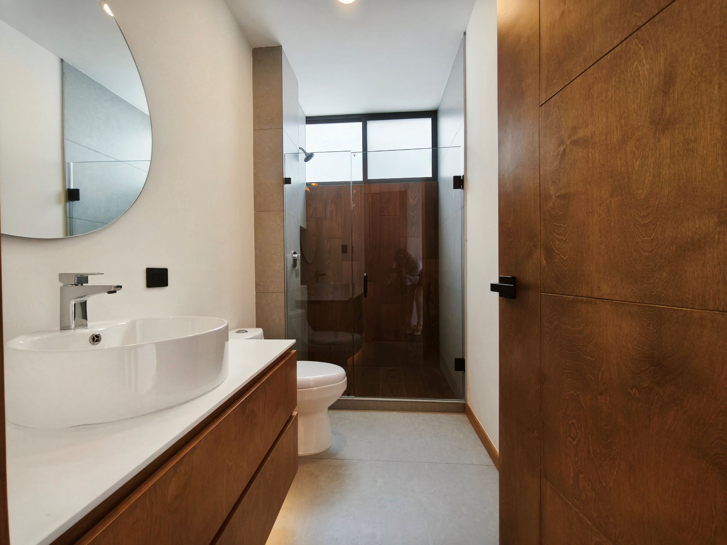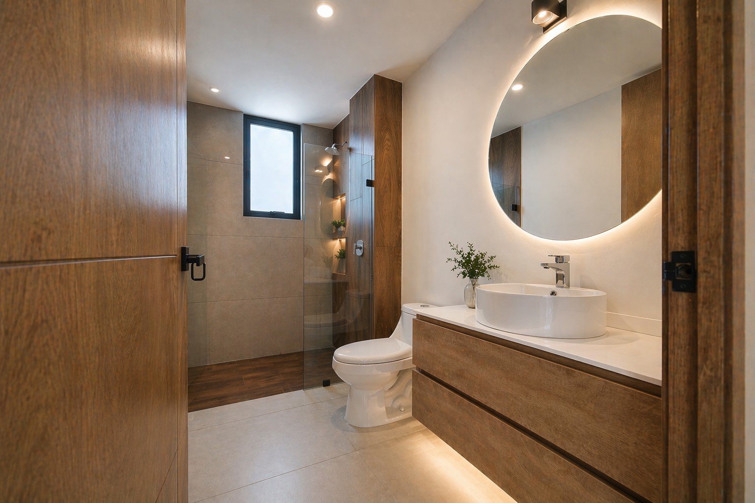 Se aprecia una carpintería en melamina texturizada tono nogal / encino ahumado, con veta natural muy elegante, utilizada en: